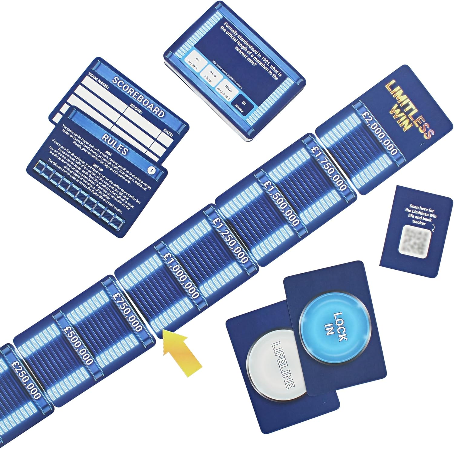 Work together answering trivia questions and see how far up the limitless money ladder you can climb. Correct answers will bank your money, but choose your answers carefully..one answer too high and it's game over ! Contents: 70 cards. 1+ players. Age 8+ years.