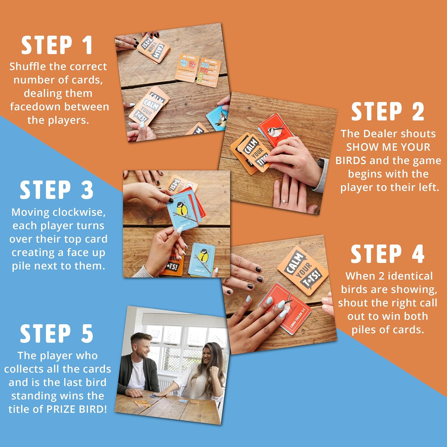 - SHOW ME YOUR BIRDS: That's what the dealer says to the person on their left to begin the game, so you can imagine the fun you'll have with this game! To start, each player takes turns to turn over a card from their own pile and place it face up, looking for identical birds across the table. If any of these face-up piles match, the first player needs to shout what BIRD type they are (i.e. "Tough Birds" or "Nice Birds").